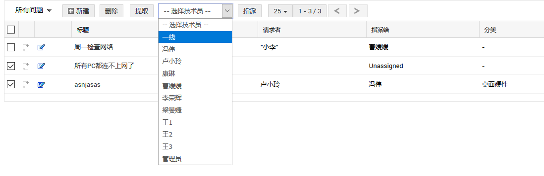 点击动作 -> 从列表选择指派技术员,弹出“为该问题指派技术员”页面,如下图所示。从列表中选择技术员,将问题指派给技术员。