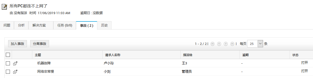 用户可将事件关联到问题。可关联类似的问题到问题,跟踪同一个问题发生的事件数量,以及根据事件的数量,跟踪问题的优先级和紧急度。