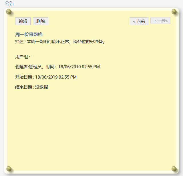 保存设置。显示如下公告页面。点击向前和向后按钮,查看上一个和下一个公告。