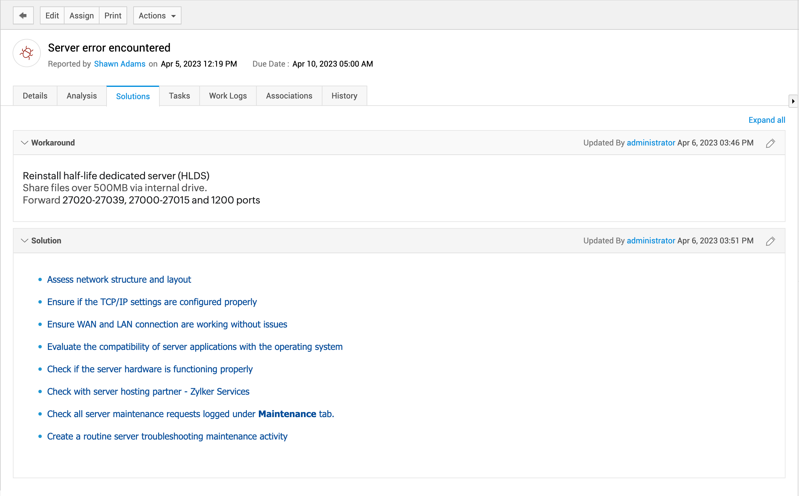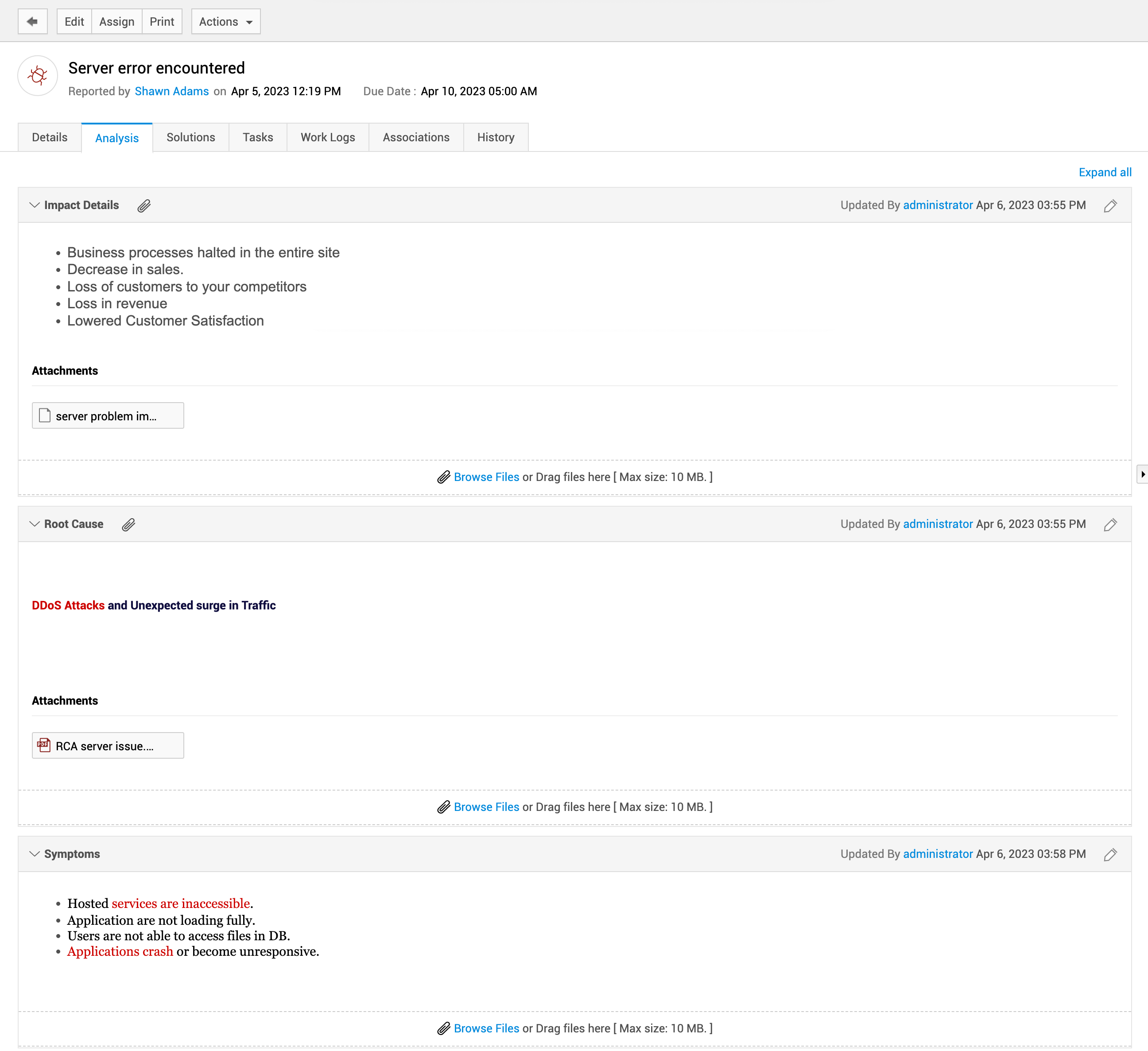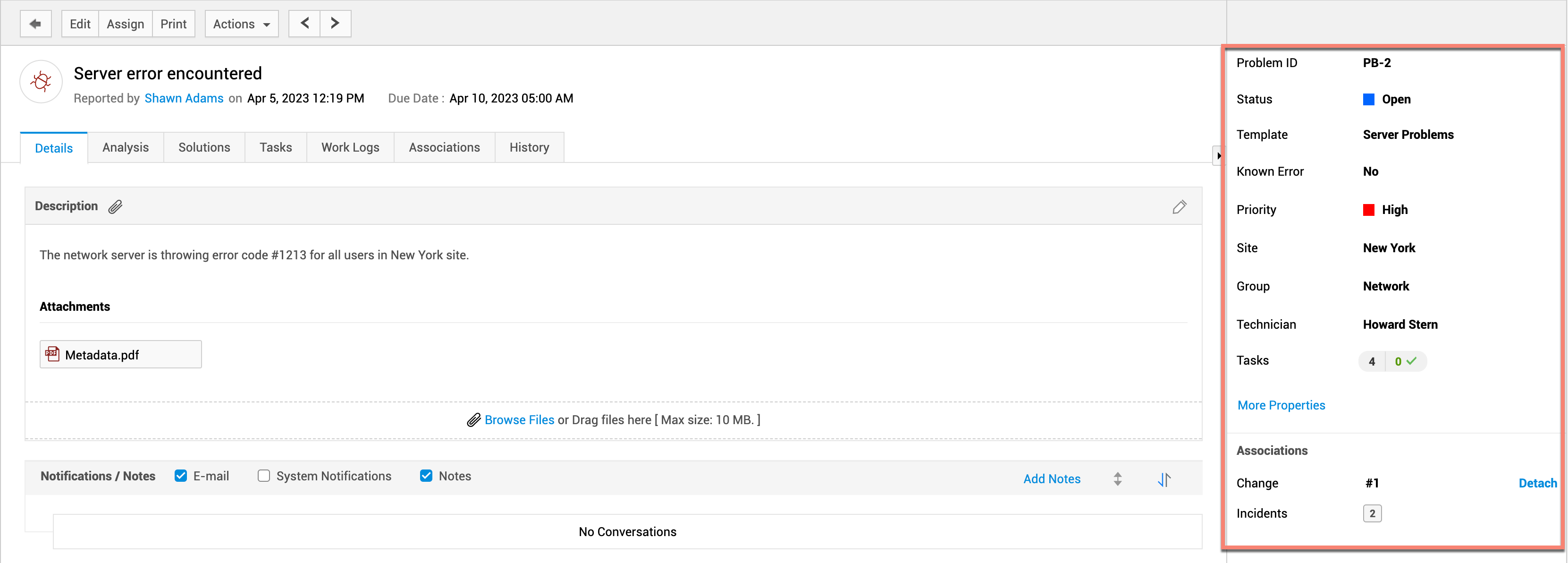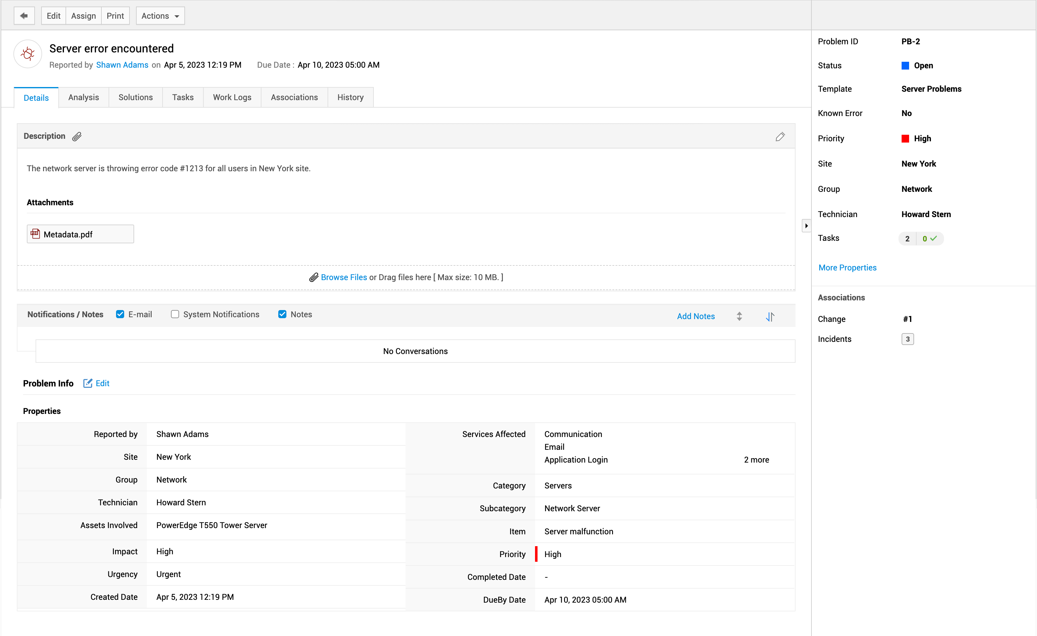 问题详情页面包含与问题请求相关的有序信息。在此页面上,技术人员可以立即执行各种操作。