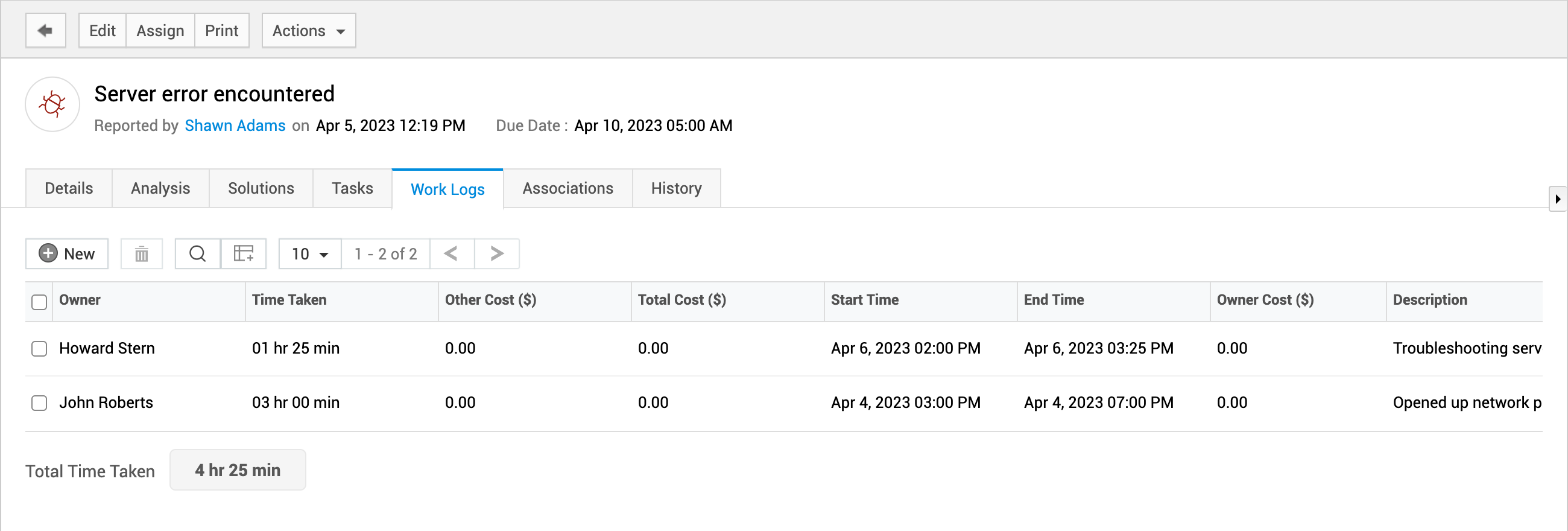 工作日志 - 跟踪技术人员在分析和解决问题过程中所投入的工作量。了解更多。