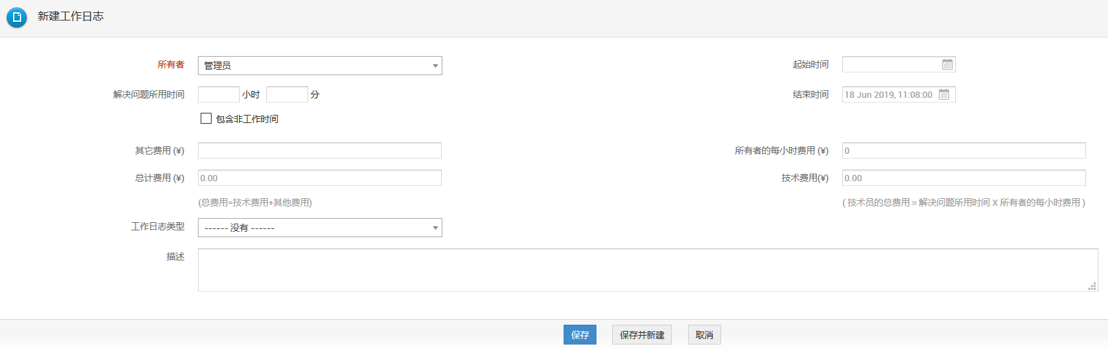 用户可利用添加工作日志选项,输入技术员处理问题所用时间明细。所用总时间是问题从创建到关闭的时间,不包括问题搁置的时间。