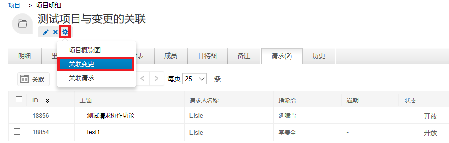 - 点击项目标题下面的设置图标(齿轮状的图标),选择关联变更的选项