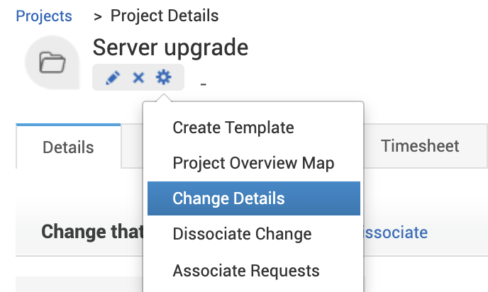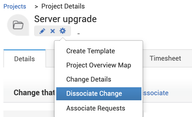 可以在项目详细信息页面中将项目与变更关联。与请求类似,变更实施也依赖于实施阶段中的项目,在该阶段可以将多个项目与变更关联/解除关联,从而将实施阶段拆分为多个项目,以确保变更根据现有文档资料得以落实。