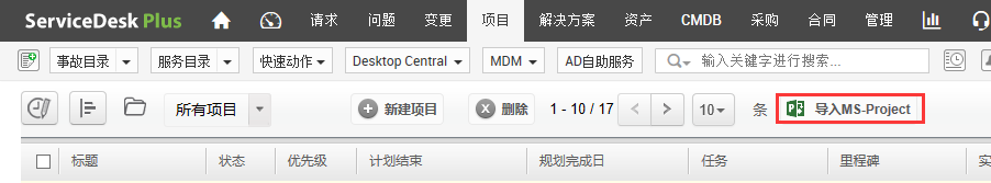 本功能可以将微软Projects下创建的项目导入到ServiceDesk Plus中。每个MS Project将被作为一个单个项目导入。导入时必须了解两种项目的属性之间的对应关系以便正确导入。