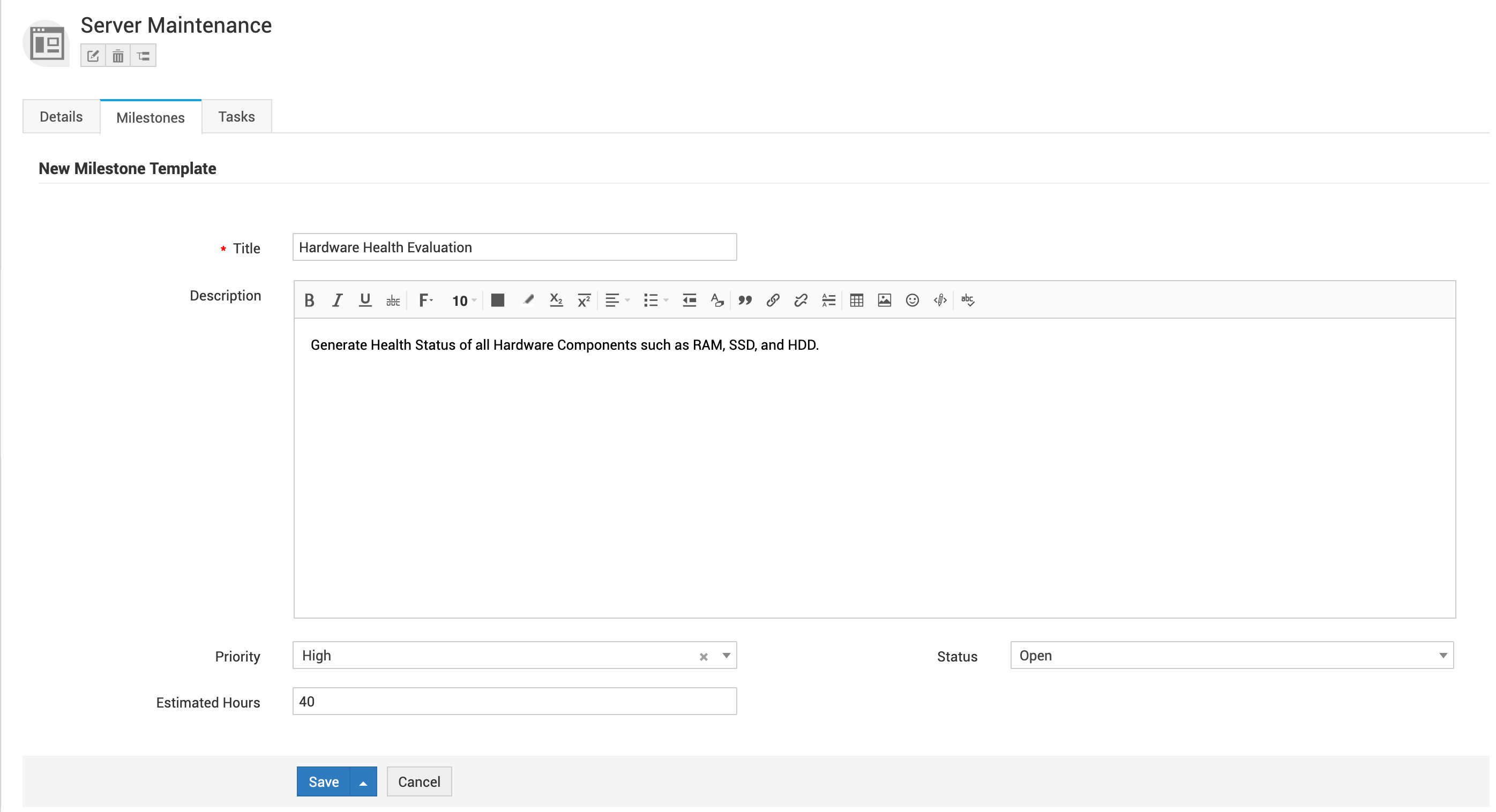 您可以向里程碑添加任务,以便高效地组织和跟踪项目。要添加里程碑任务,请在里程碑详细信息页面上单击任务选项卡,然后通过填写必填字段创建新任务。