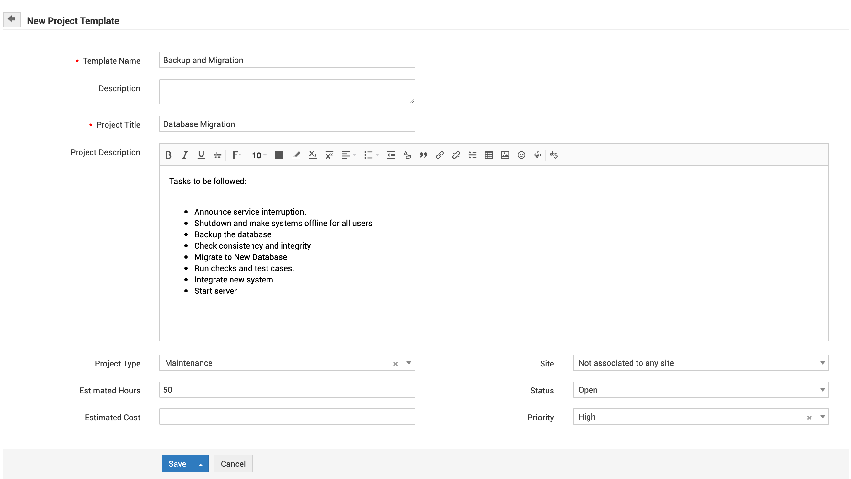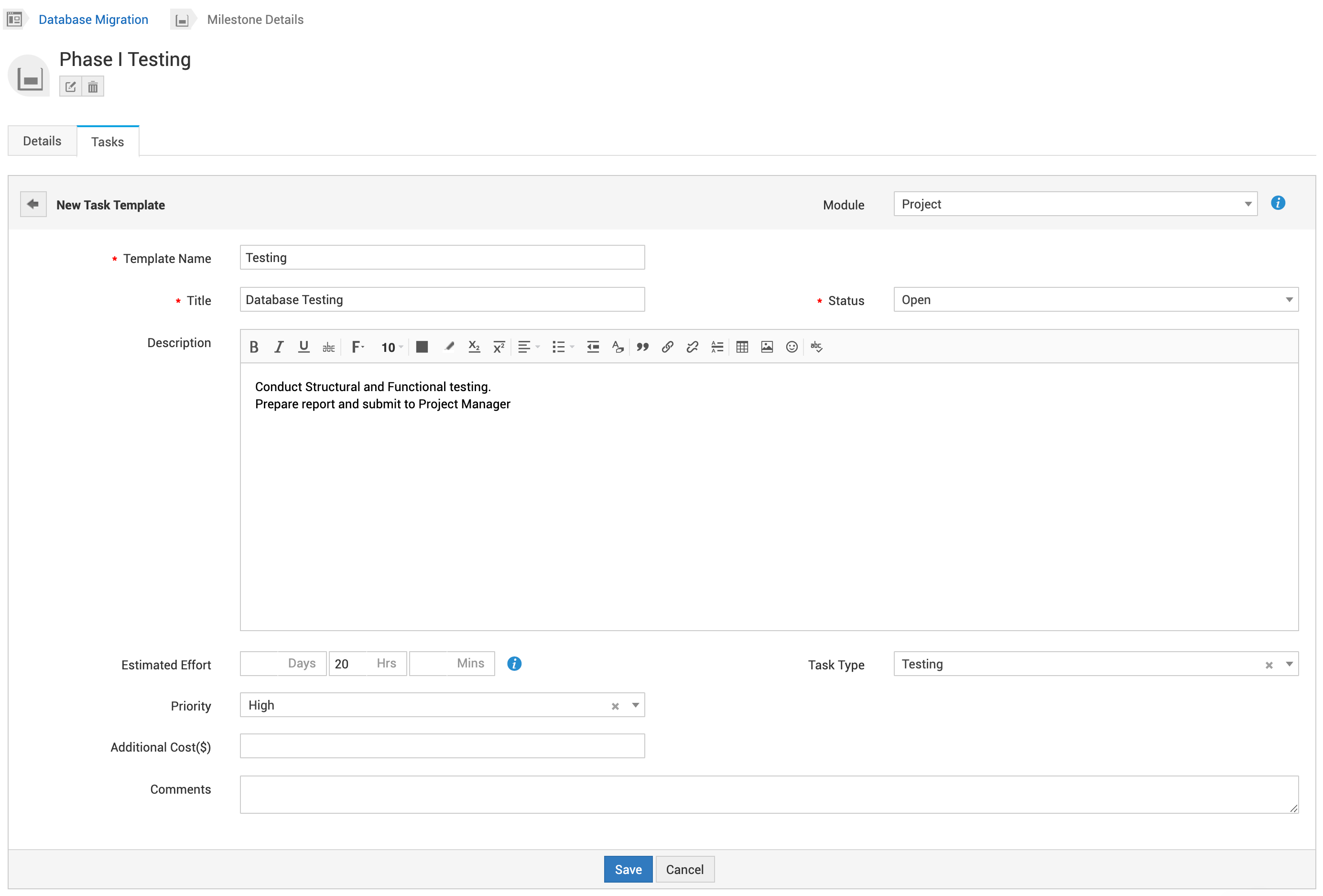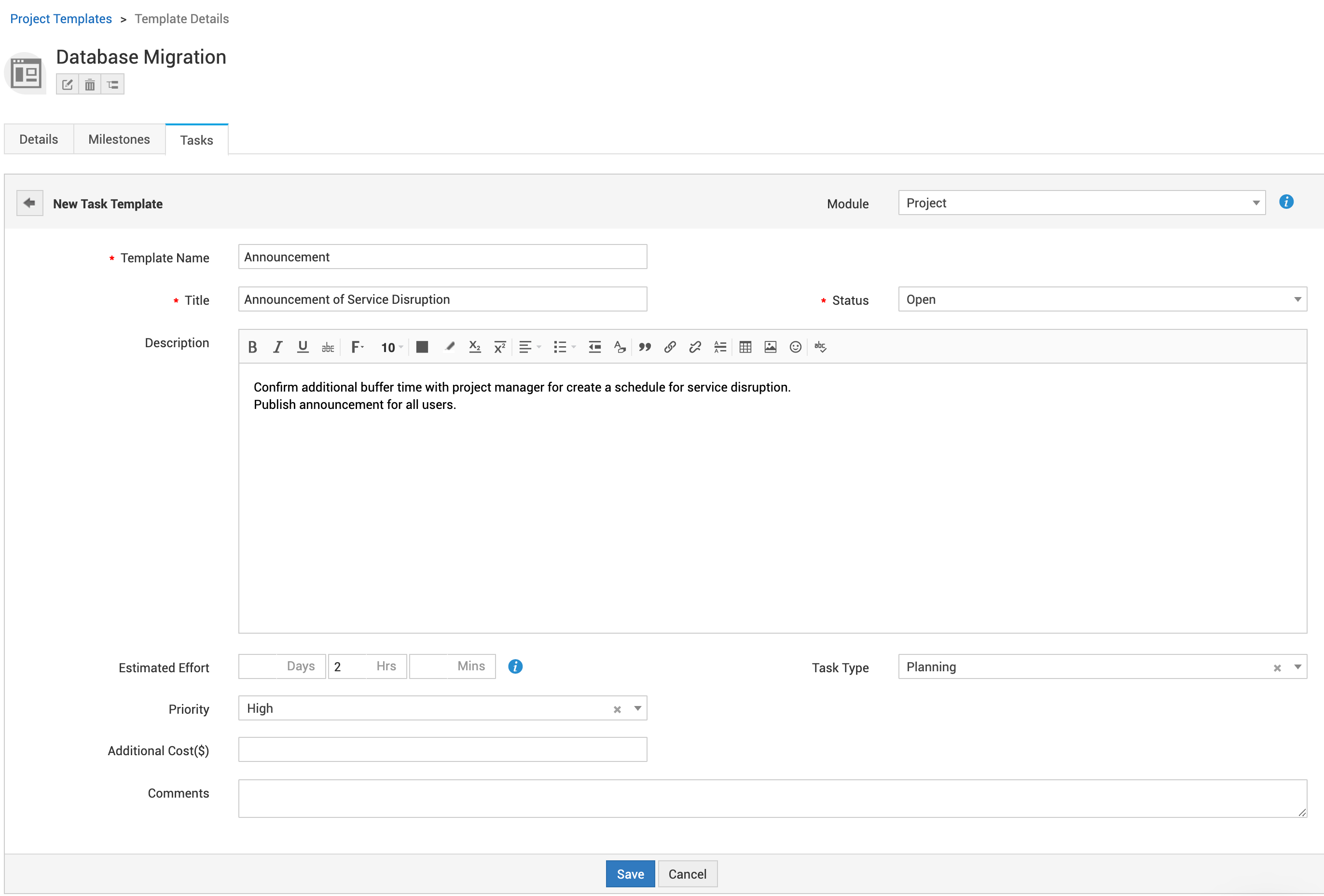 使用模板管理项目是节省时间和精力的绝佳方式,否则这些时间和精力可能会浪费在创建重复性任务上。这也是在执行任务顺序甚至任务类型方面,在类似项目之间建立一致性的有效方法。项目模板功能允许您添加里程碑,并在每个里程碑下关联任务,同时提供项目相关成本和所需时间的估算。总的来说,此功能让您能够轻松、简便地处理重复性项目,例如为新员工创建工作区、上传网站或升级软件application。