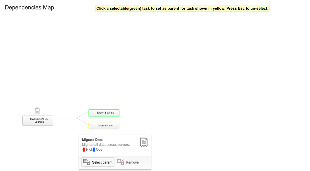 要定义任务依赖关系,请选择一个里程碑,单击任务选项卡,然后单击依赖关系按钮。系统将显示依赖关系图,您可以在其中定义该里程碑下任务之间的父子依赖关系。如下面的屏幕截图所示,将鼠标指针悬停在某个任务上,该任务将以绿色高亮显示,然后选择其父任务,父任务将以黄色高亮显示。