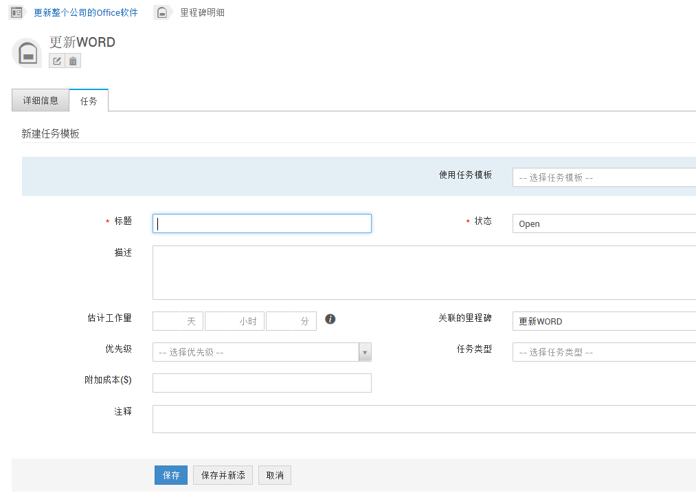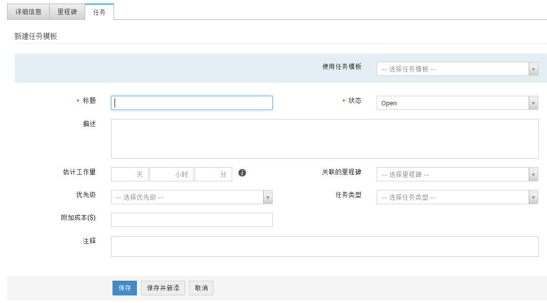 注意: 在保存按钮上,有下拉菜单:“保存并继续添加”,可以保存当前里程碑并继续添加其它新的里程碑。“保存并添加任务”,可保存当前里程碑。并为该里程碑添加任务。