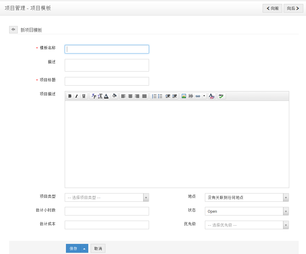 注意: 在保存按钮上,有下拉菜单:“保存并继续添加”,可以保存当前模板并继续添加其它新的项目模板。“保存并添加里程碑”,可保存当前模板。并为该模板添加里程碑。“保存并添加任务”,可保存当前模板,并为该模板添加任务。