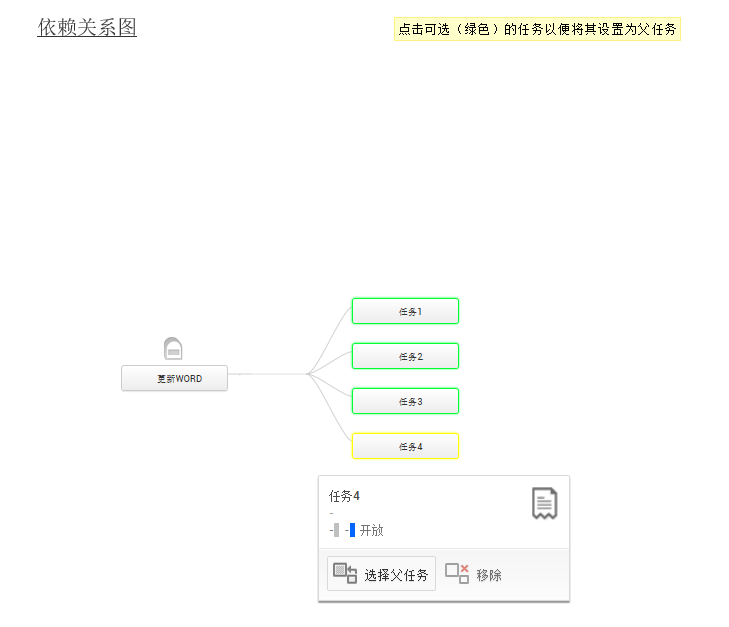 要定义任务的依赖关系,选择相应的里程碑,点击任务页签,然后点击依赖性按钮,将显示依赖关系图的页面,在此,您可以定义各个任务之间的父子关系。如下图所示,当把鼠标指向某个要定义其依赖关系的任务时,将会出现下拉菜单,让您选择其父任务。点击“选择父任务”时。绿色高亮显示的任务可以作为其父任务。
