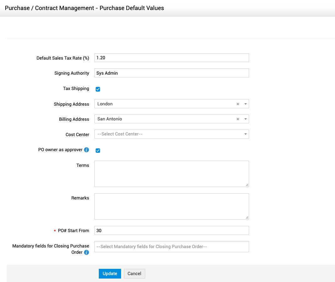 在采购/合同模块中,单击“采购 - 默认值”。这将打开“采购默认值”页面。