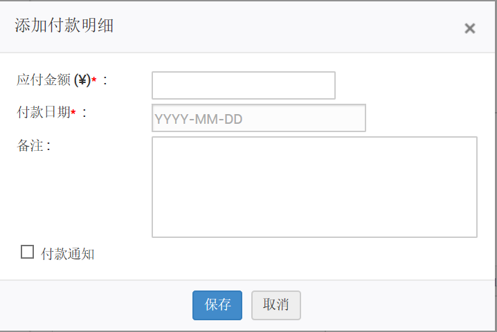 从采购订单详情页面,单击动作下拉菜单- >添加付款明细选项。弹出添加付款对话框。