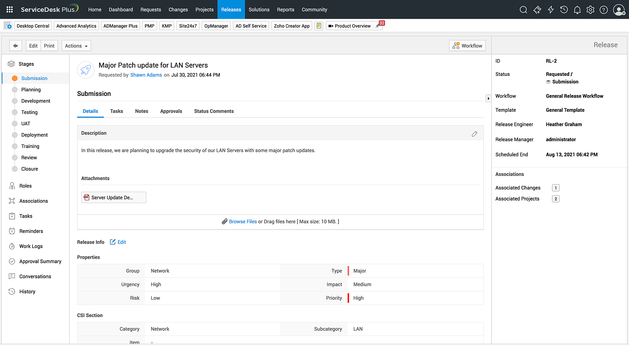 发布详情页面汇集了与发布相关的所有详细信息。这些详情经过结构化组织,可帮助技术人员即时访问信息。请求详情页面中的每个元素都是专门定制的,旨在简化 ServiceDesk Plus 中技术人员的日常工作。