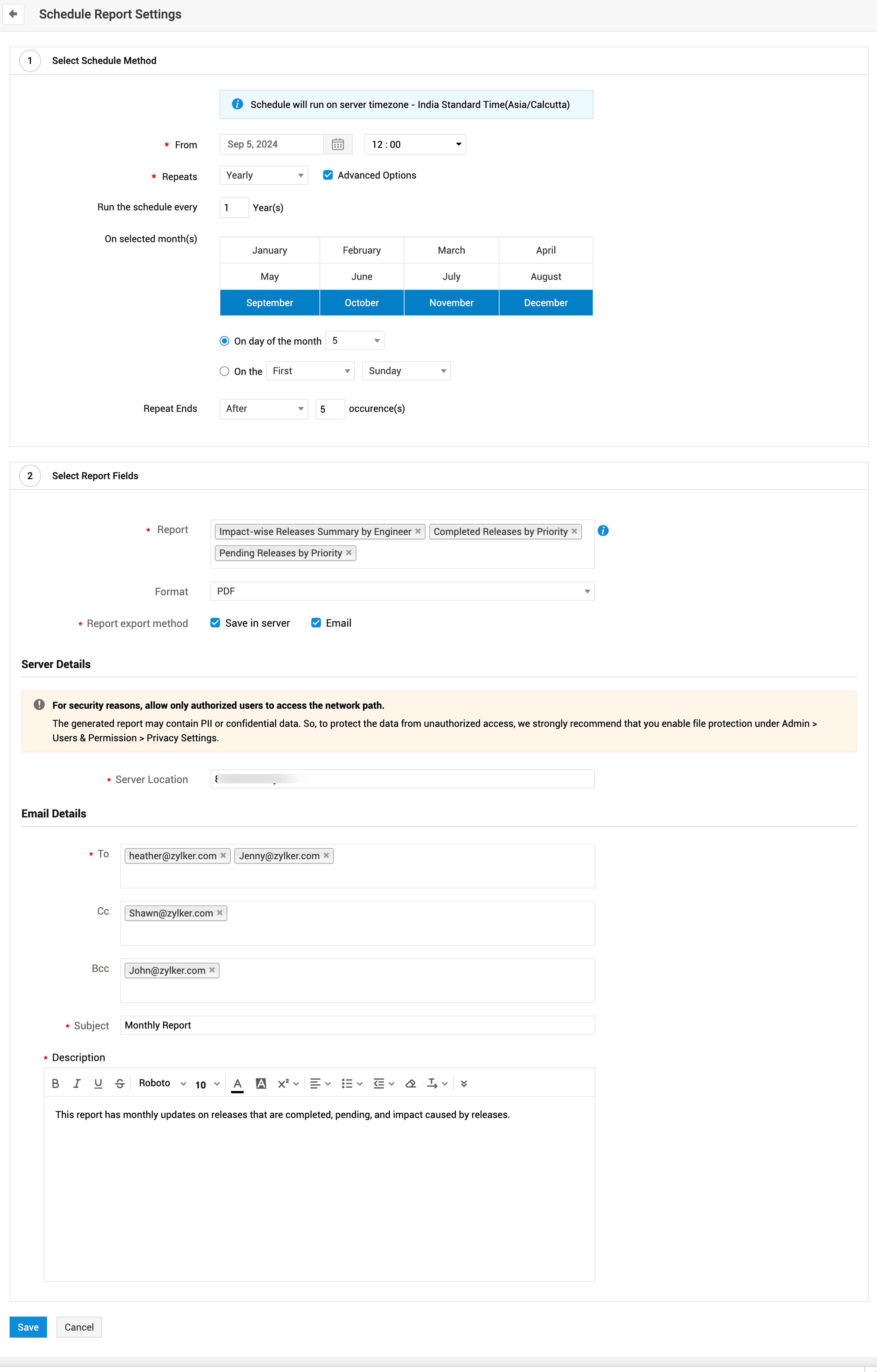 使用计划报表设置,您可以在预定时间自动生成多个不同格式的报表。这些报表可生成为 PDF、XLS、XLSX、HTML、内联 HTML、CSV、DOC、DOCX 或 XML 格式,并通过电子邮件共享或保存到Server。