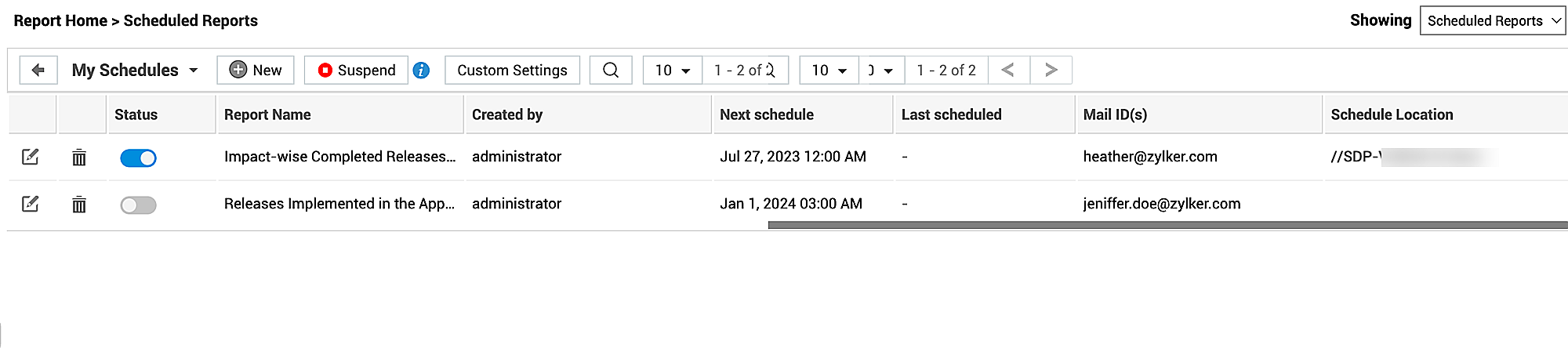 在“计划报表”列表视图中,您可以创建、启用、禁用、筛选、挂起、恢复、编辑或删除计划报表。要执行这些操作,请转到 报表 > 显示 > 计划报表。