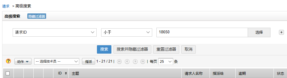 高级搜索功能,可以按照多个过滤条件和相应的操作运算符,对请求进行搜索。过滤条件可以针对多种字段。