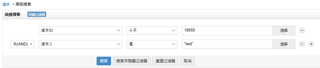 在添加条件之前,搜索、搜索并隐藏过滤器、重置过滤器按钮是被禁用的,只有取消按钮可用,点击它将返回请求列表视图。输入条件之后,这些按钮才可用。