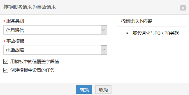 在将服务请求转换为事故请求时,需要注意以下几点: