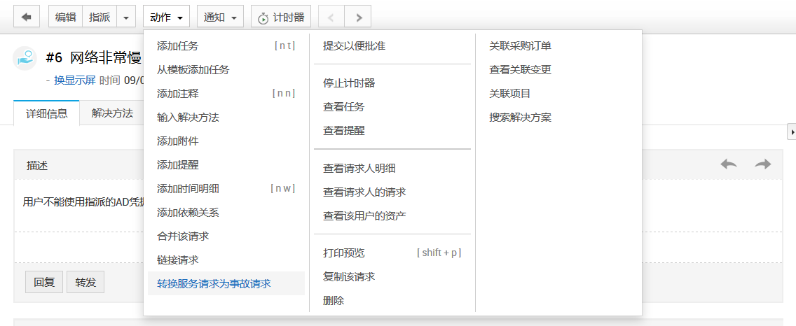 1.单击“请求详细信息”页中的“操作”选项卡。从列出的选项中,单击将服务请求转换为事故请求。