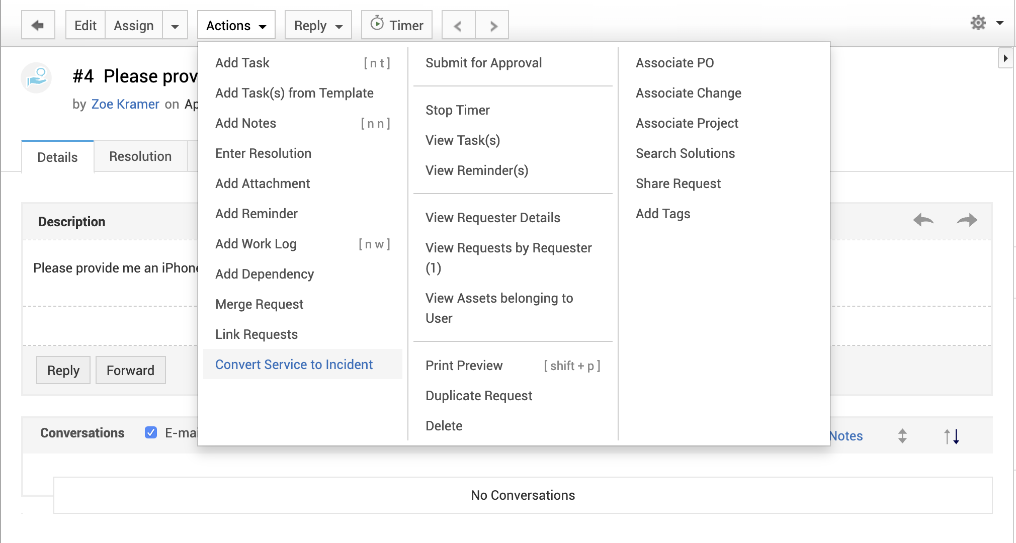 1. 进入请求详细信息页面,方法是选择您所需请求的主题行,然后从操作下拉菜单中单击将服务转换为事件