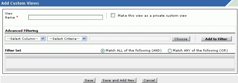Save the filter criteria details. To add another custom view click Save and Add New button.