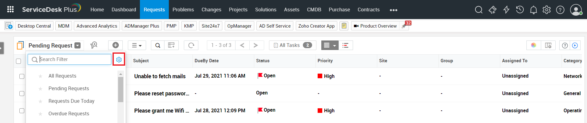 自定义视图可帮助您通过自定义请求列表视图,根据特定条件显示请求,从而对请求进行排序。比如,您是一名技术人员,只关注来自某个站点的高优先级请求。与其每次都在请求列表视图中执行搜索,不如创建一个自定义视图,根据优先级筛选请求。