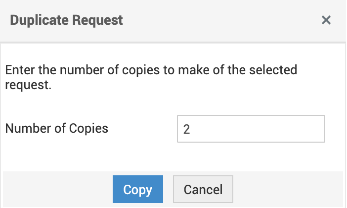 单击“操作”组合框下的复制请求选项。此时会打开复制请求弹出窗口,要求您输入副本数量。
