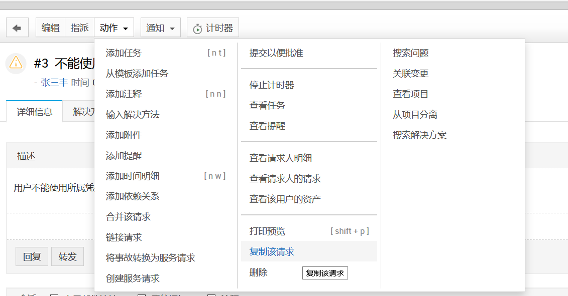 此功能允许用户通过复制现有类似的服务请求创建新的服务请求。复制请求后,将显示一个新的服务请求页面,其中包含从现有请求复制的请求详细信息。用户还可以编辑请求详细信息。执行复制服务请求,