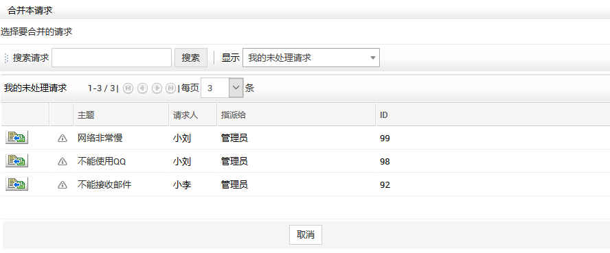 当两个或多个请求相关并且来自同一个请求人,而且可以由同一个技术员处理,则可以合并该请求,并指派该请求到一个技术员。