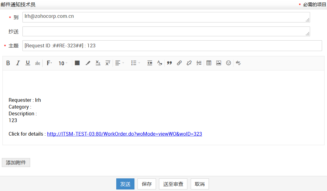 在查看请求页的右侧任务块,点击通知下邮件通知技术员,将打开邮件通知技术员的表单。