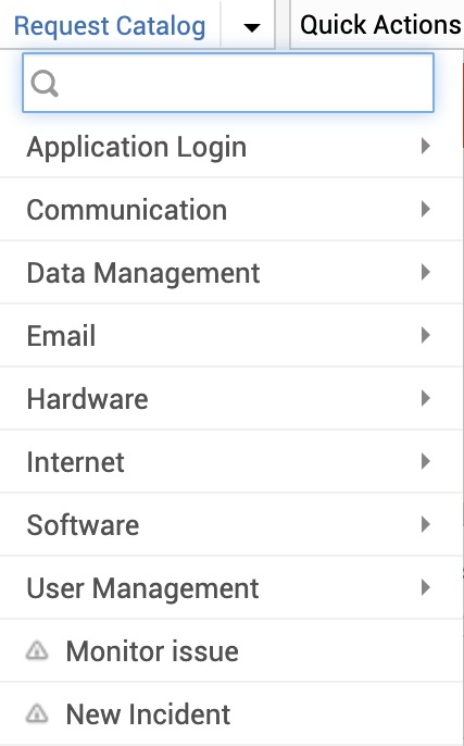 与“新建事件”下拉菜单类似,“服务目录”下拉菜单会列出在application中配置的所有服务项。服务项按服务类别分组,便于参考和识别。您可以从可用的服务项列表中浏览并提交服务请求。