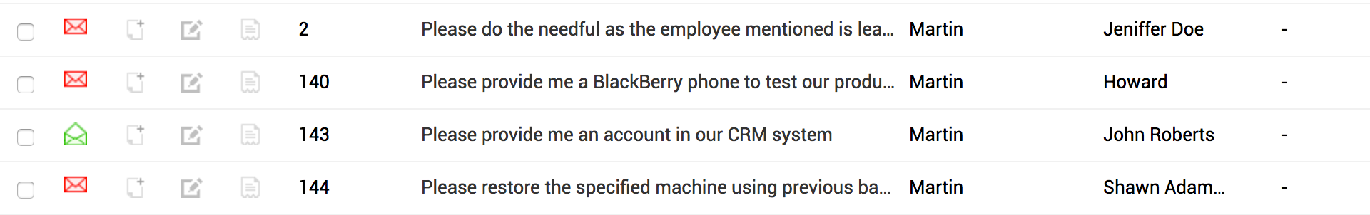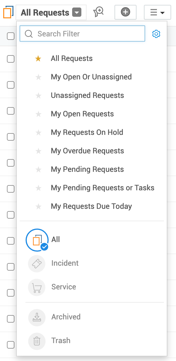 请求列表视图包含多个筛选器。您可以使用相应的筛选器查看已归档和已移至回收站的请求。您还可以: