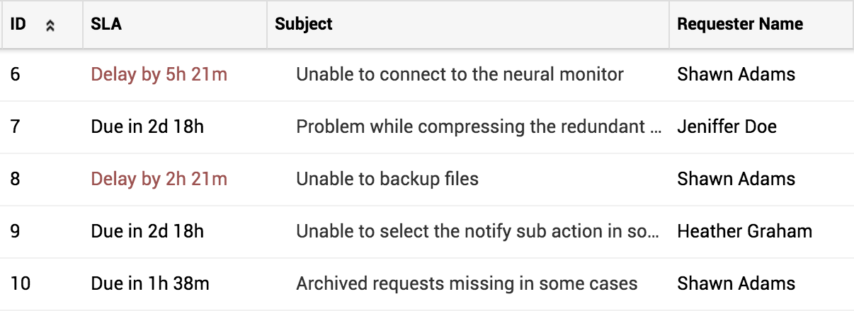 启用 SLA 列后,将显示请求的剩余时间以及请求的延迟时间,且不考虑非工作时间。