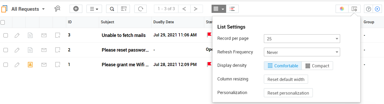 您可以在“列表设置”中配置每页记录数、刷新频率、显示密度、列大小调整和个性化,以自定义列表视图。