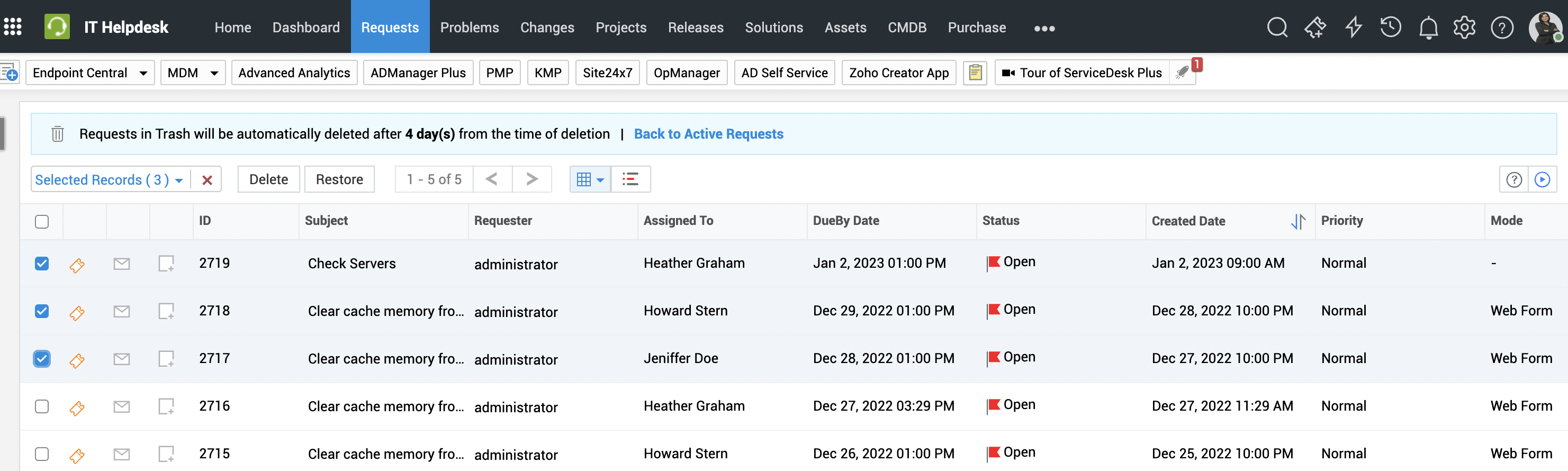 ServiceDesk Plus 允许您在预先配置的时间间隔内恢复已删除的请求。通过请求筛选器下提供的请求回收站选项,技术人员可以在配置的时间期限内恢复已删除的请求。超过配置的时间期限后,这些请求将被永久删除且无法恢复。