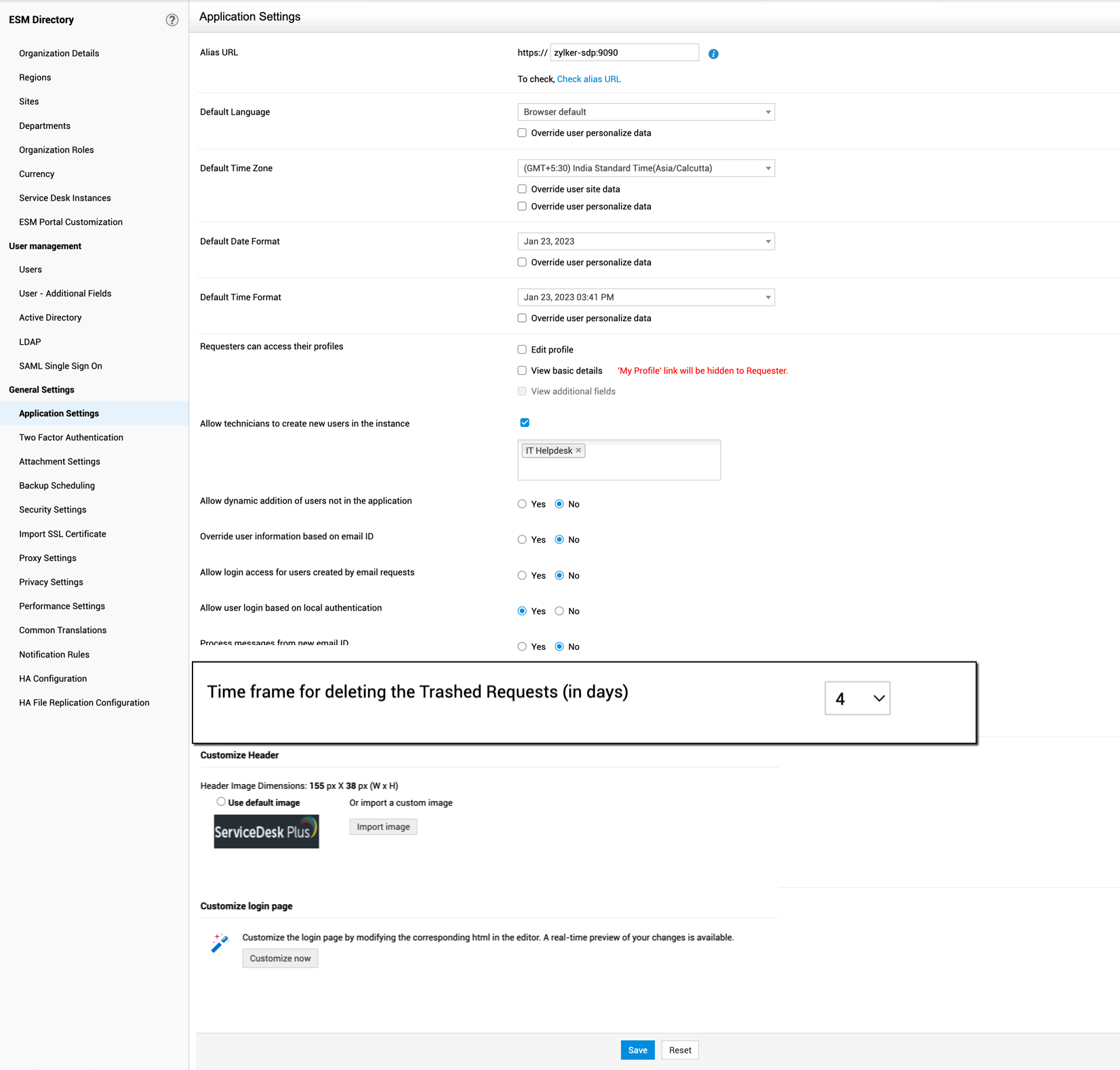 请求回收站会将已删除的请求保留配置的天数,之后这些请求将被永久删除。SDAdmin 最多可将请求在回收站中的保留时间配置为 10 天。SDAdmin 可在ESM 目录 > 常规设置 > application 设置下配置此设置。