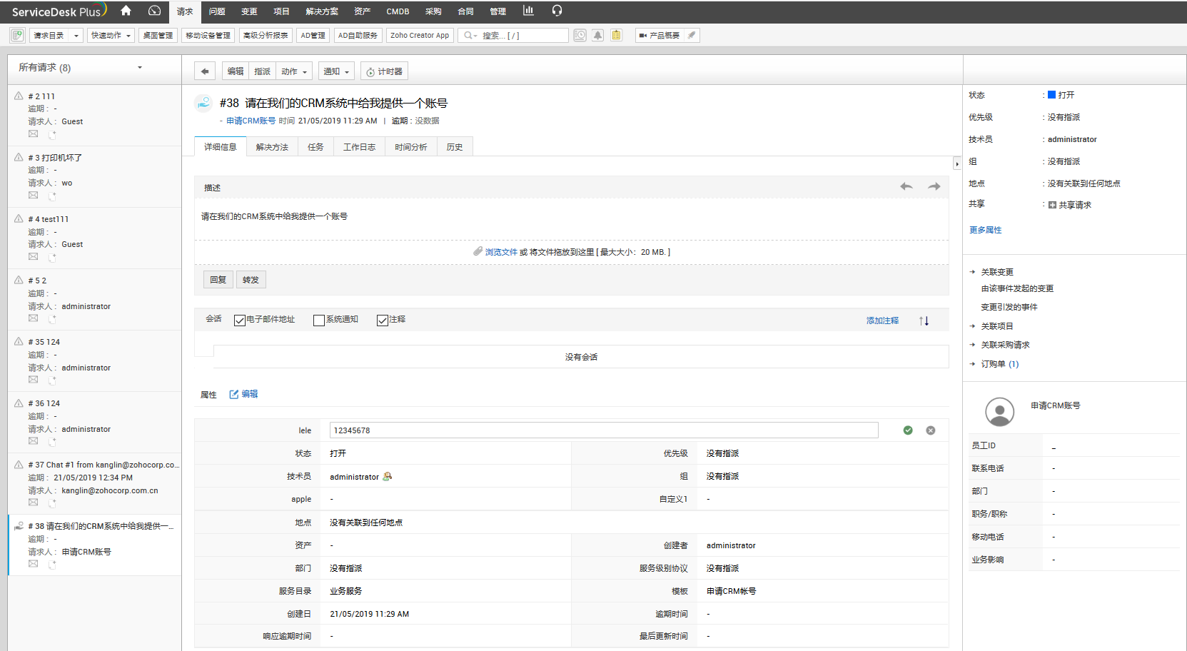 请求详细信息页根据各工单级别向技术员提供请求,节省技术员的时间和精力。从页面布局到导航、功能及其位置、颜色方案到可用性等各个元素,有效地提高了技术员通过ServiceDesk Plus处理工单的效率,为技术员节省时间就是为整个帮助台管理节省时间,有效简化了技术员的工作。