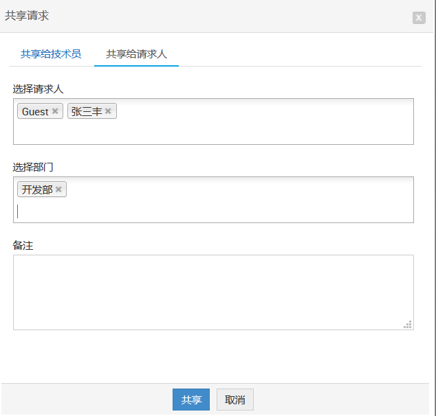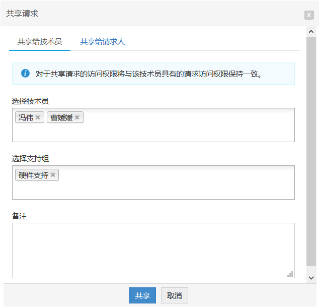 步骤2:弹出“共享”窗口,如果要技术员共享,请单击“共享给技术员”,如果要与请求人共享,请单击“共享给请求人”。