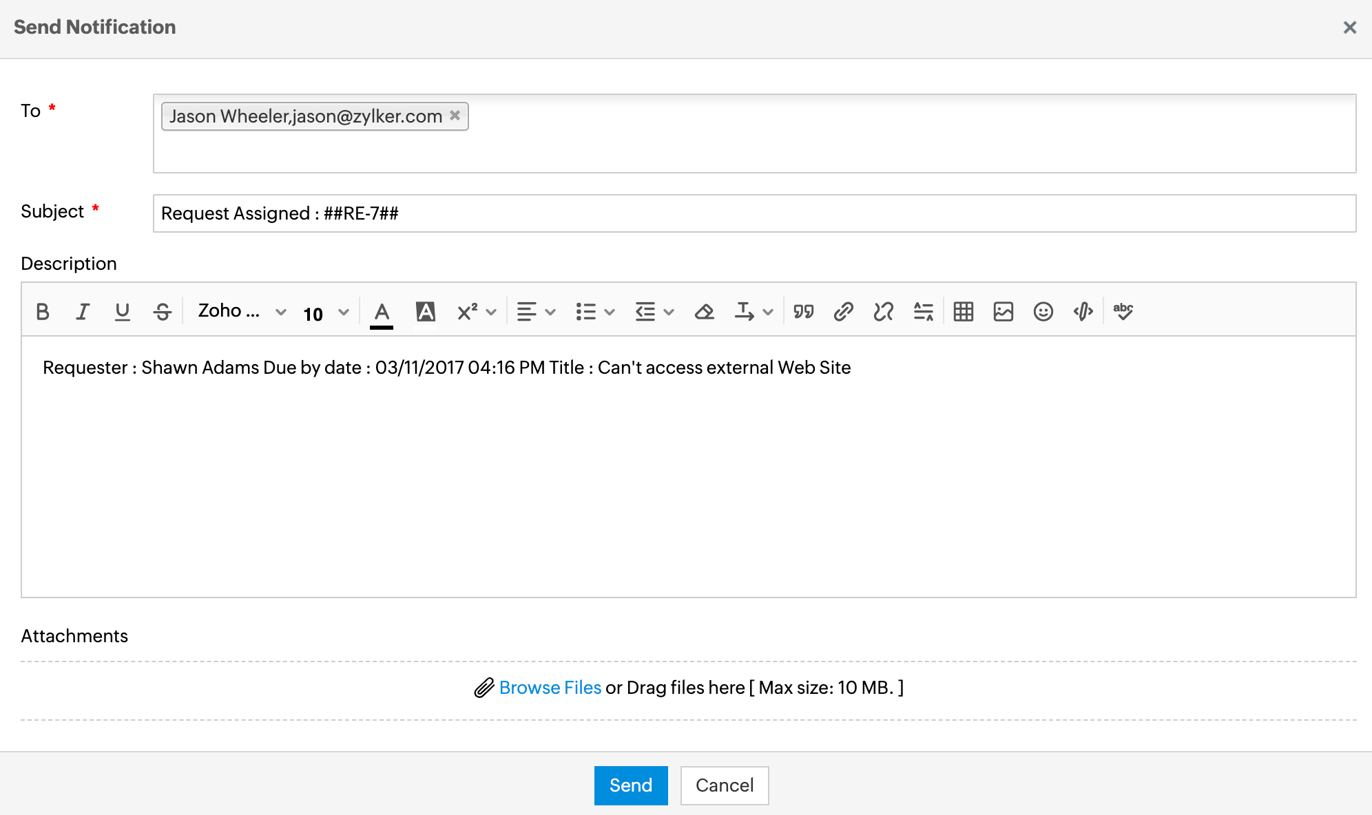 要在有新请求分配给技术人员时自动提醒他们,请启用管理 > 通知规则 > 在请求被分配时通过短信提醒技术人员选项。您还可以通过在通知规则中选择自定义模板链接来修改主题和描述的默认内容。