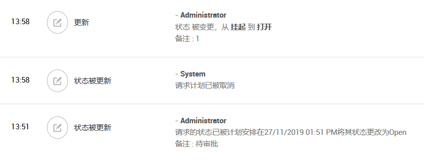 可以在“请求详细信息”页的“历史记录”选项卡中查看状态变更备注。