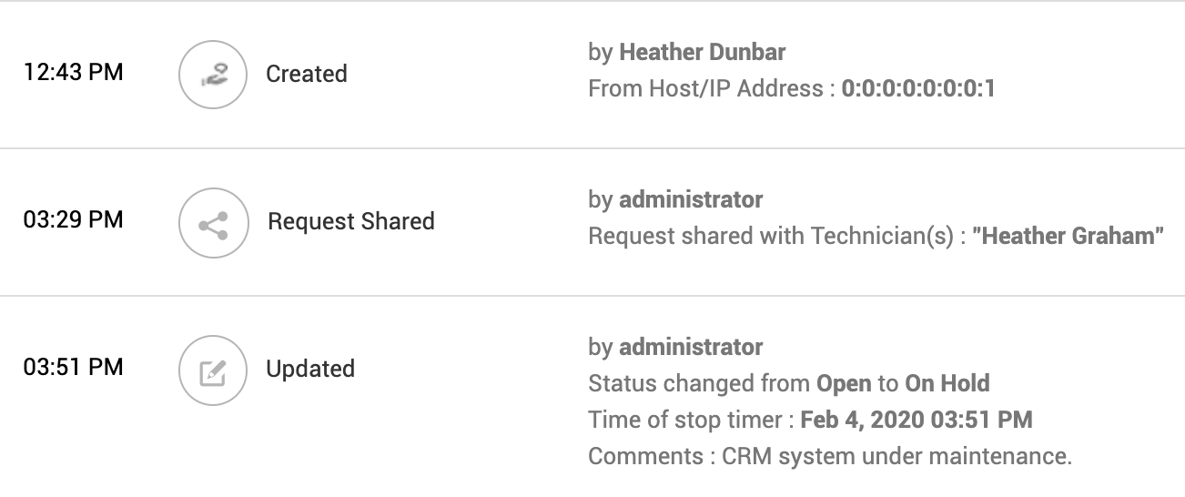 状态更改评论也可以在请求详细信息页面的 历史记录 选项卡中查看。