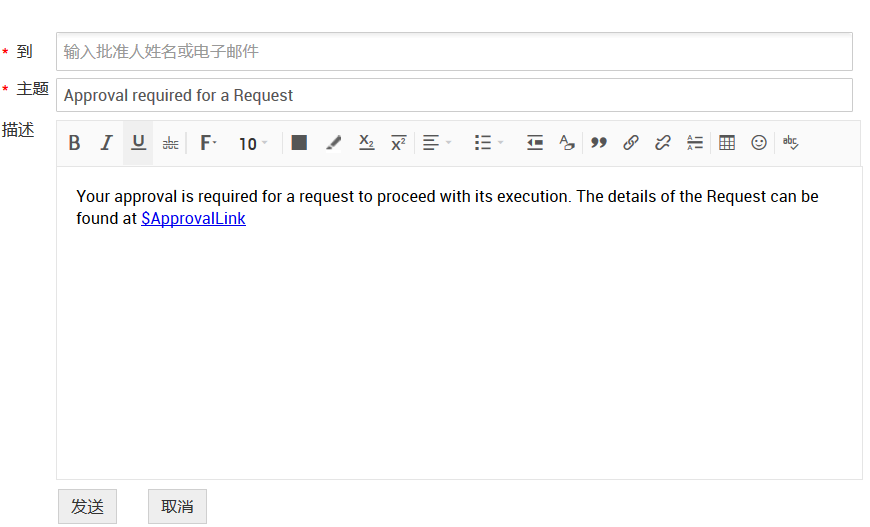 在描述文本框中输入相应的描述。$ApprovalLink 是一个变量,邮件中会用请求明细的链接所代替。