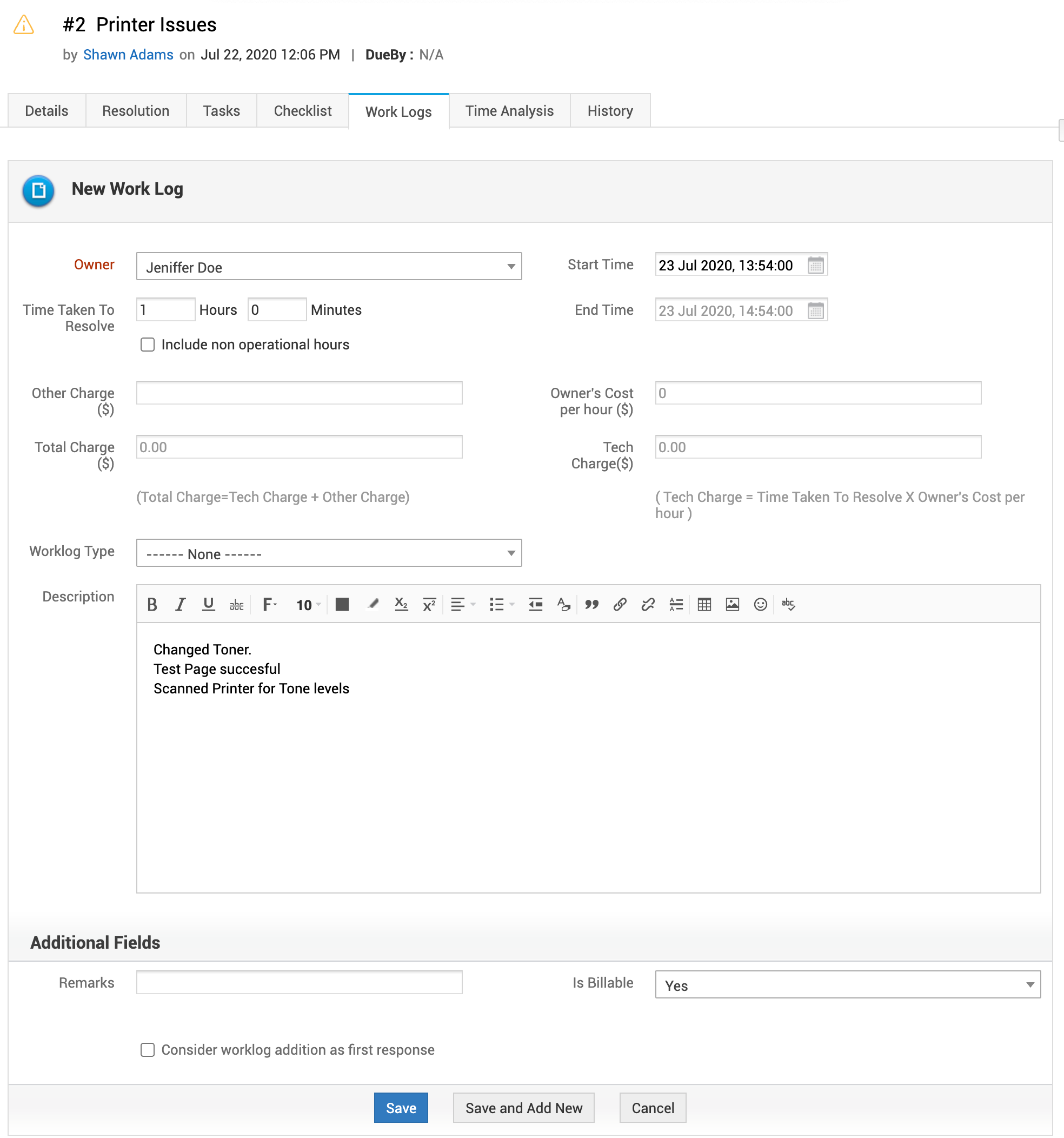 工作日志是一个通用平台,用于记录各个技术人员在处理请求中的问题或任务时所花费的时间。在工作日志中,技术人员可以简要说明其工作内容、注明解决所耗时间、涉及的成本,并将工作日志添加为首次响应。