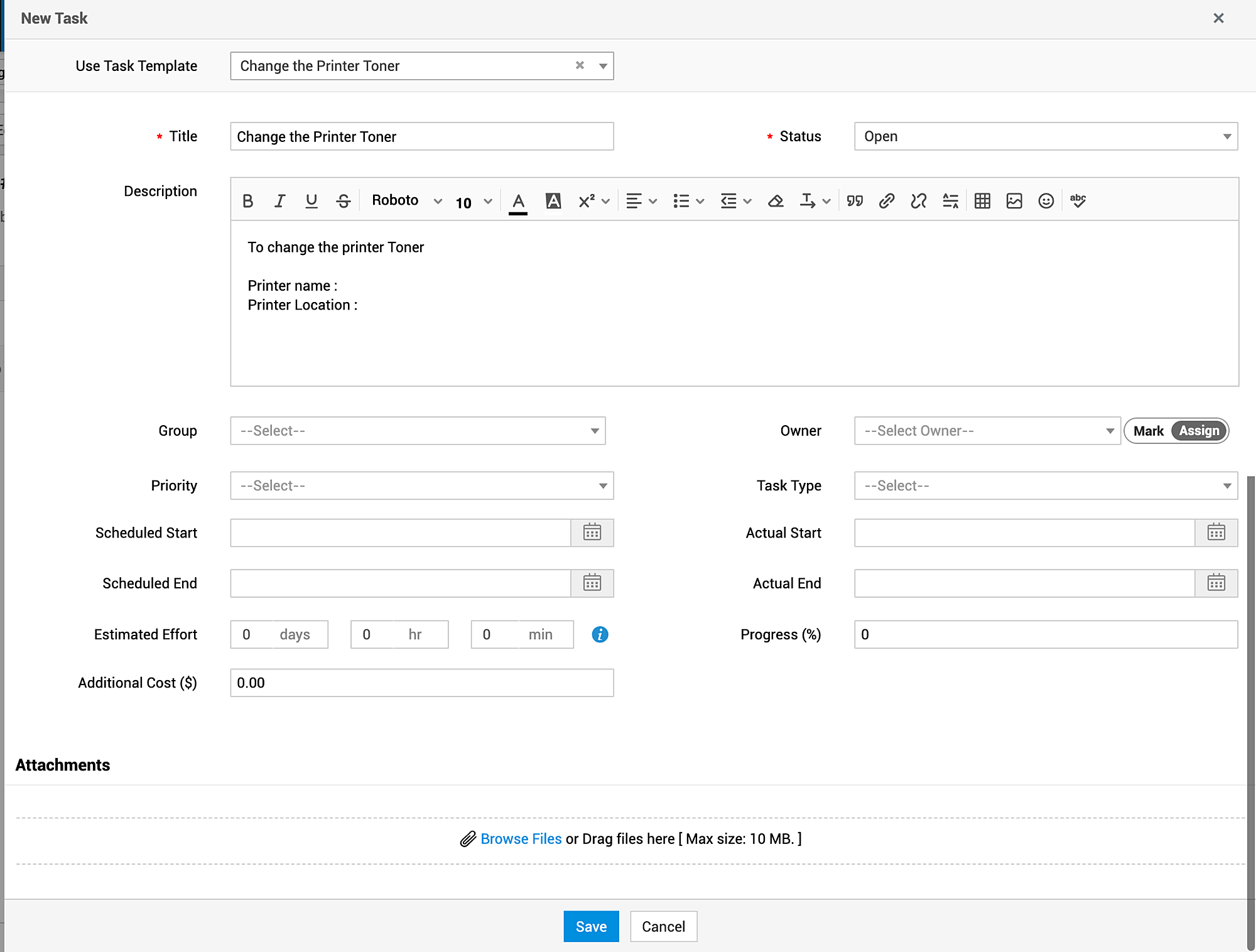 下拉菜单中选择一个模板。模板中添加的详细信息将自动填充到任务表单中。请参阅