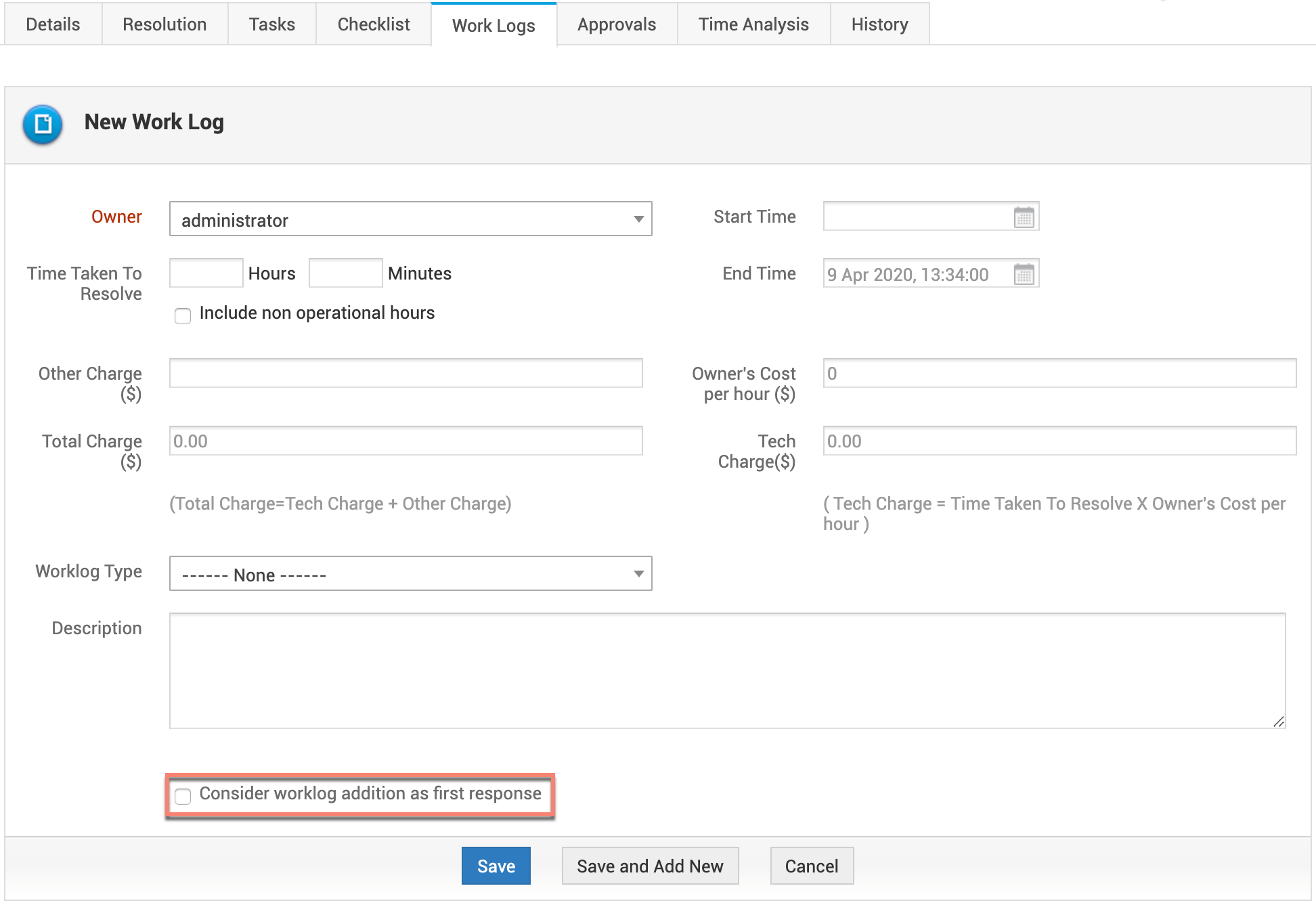 - 启用此选项后,添加工作日志时的日期/时间将被视为该请求的首次响应时间