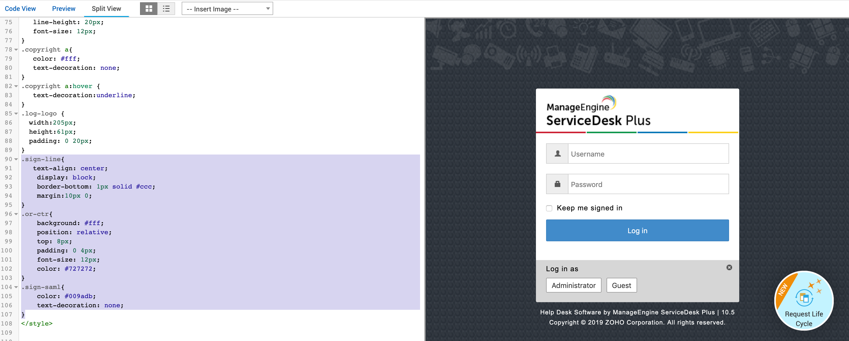 在 HTML 编辑器中,添加截图中所示的类。这些类也可在 <server_home>\custom\login\default.html 中找到