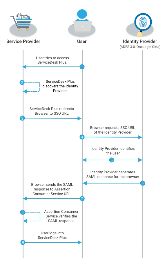 SAML 在两个实体之间交换身份验证和授权数据,即 身份提供商(IdP)和 服务提供商(SP)。此处 ServiceDesk Plus 作为 SP,在集成后,用户可直接从 IdP 登录到 application,而无需提供任何登录凭据。
