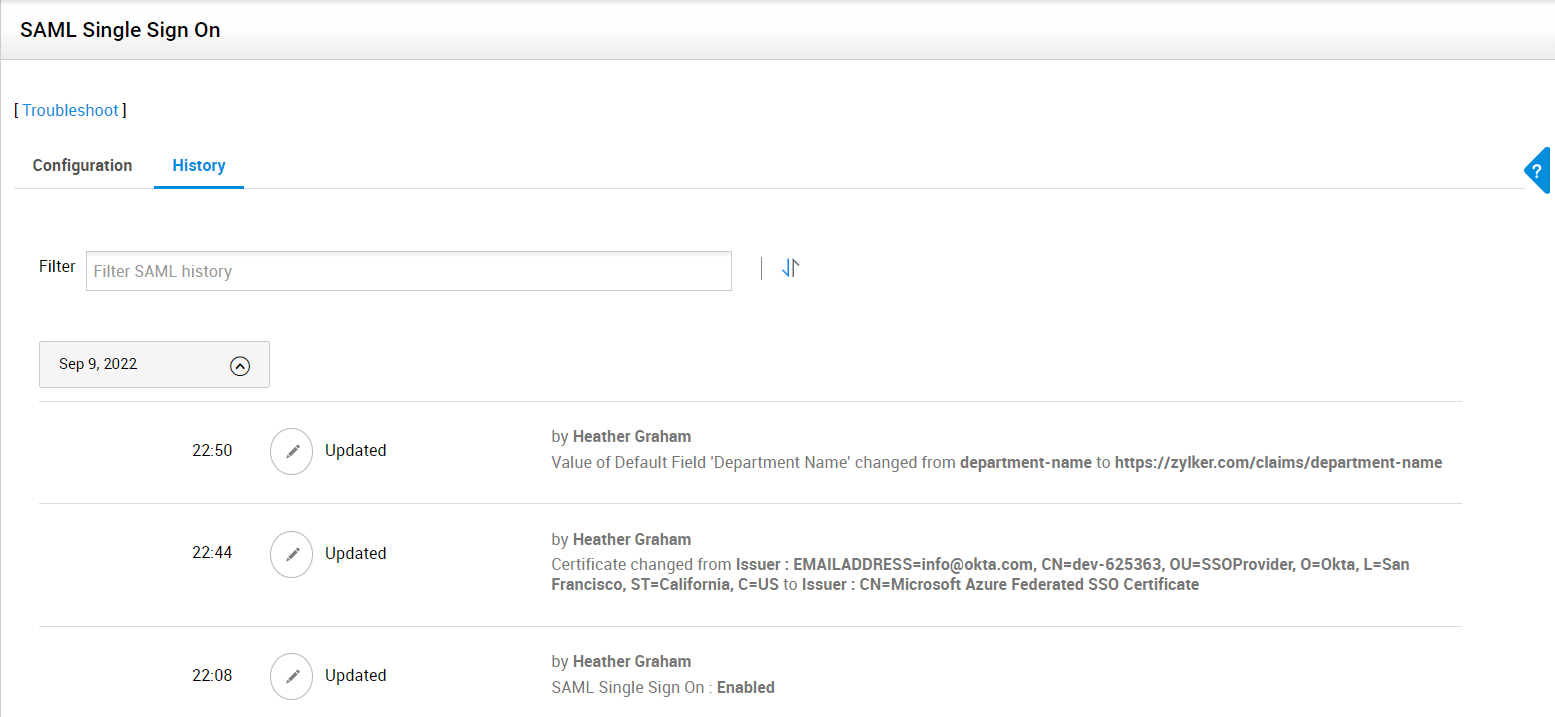 历史记录选项卡列出了在配置选项卡下执行的所有活动。您可以使用预定义筛选器查看与特定属性相关的活动。