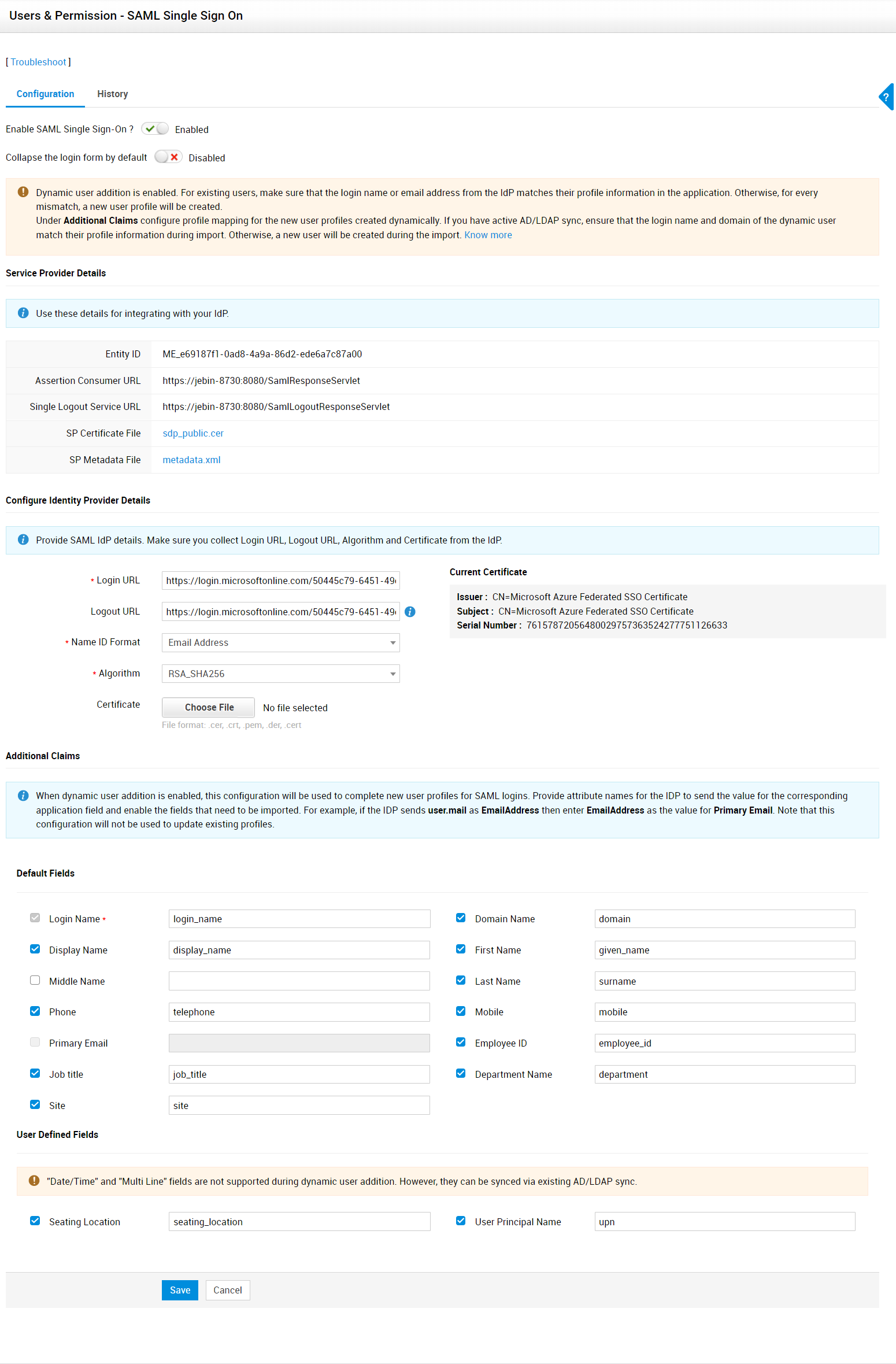 在您的 IdP 中将 ServiceDesk Plus 配置为 SP 后,请返回 ServiceDesk Plus 中的 SAML 配置页面,并按如下所述配置身份提供商详细信息和其他声明。